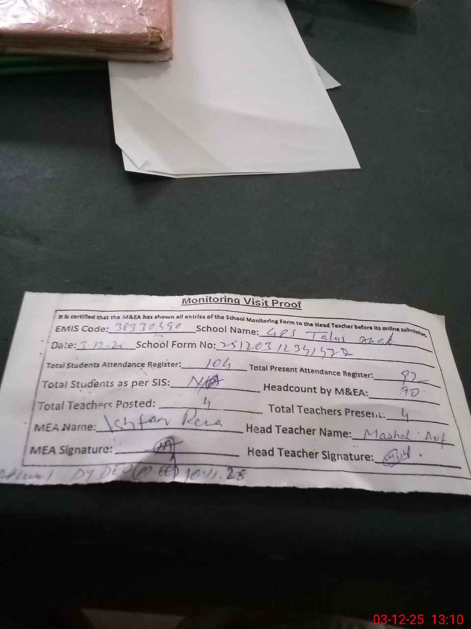 | Attendance Register | Head Teacher | MEA with School | Visit Proof |