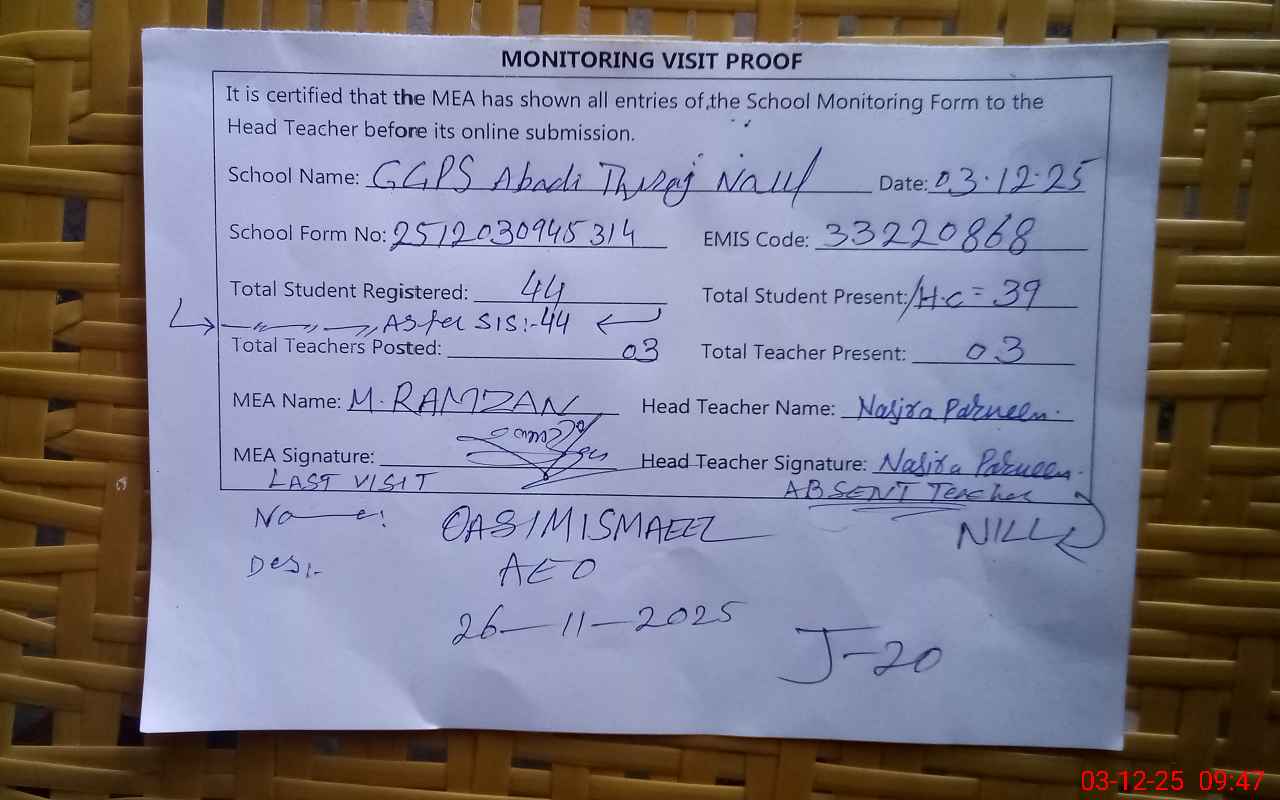 | EMIS Code: 33220868 | Name of School: GGPS ABADI THIRAJ NAUL | |||