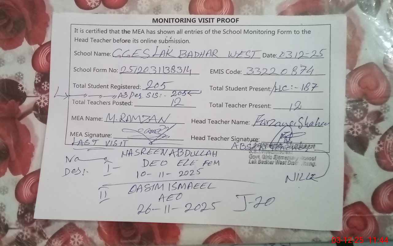 | EMIS Code: 33220874 | Name of School: GGES LAK BADHAR WEST | |||