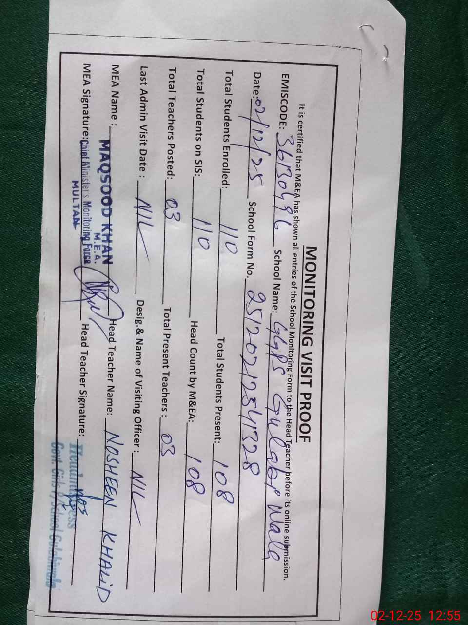 | Certified that this School was Inspected by the Undersigned MEA/DMO Today and the Information Stated Above is as Per Record. | |||||