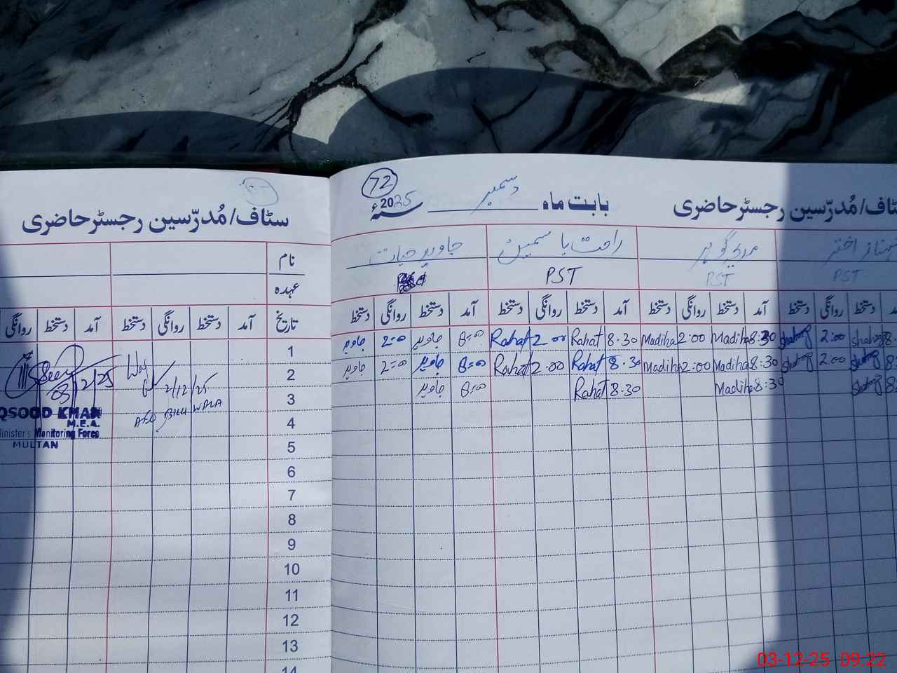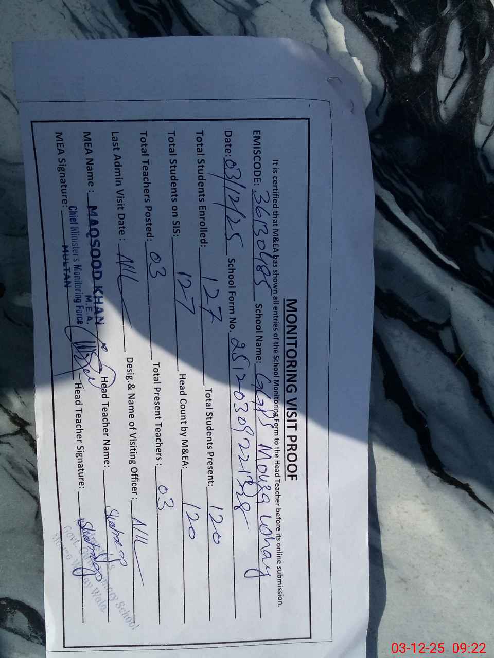 | Name: SH**** AK**** Designation: (School Headmaster's/Headmistress's) PST Phone/Cell Number: 03**** |