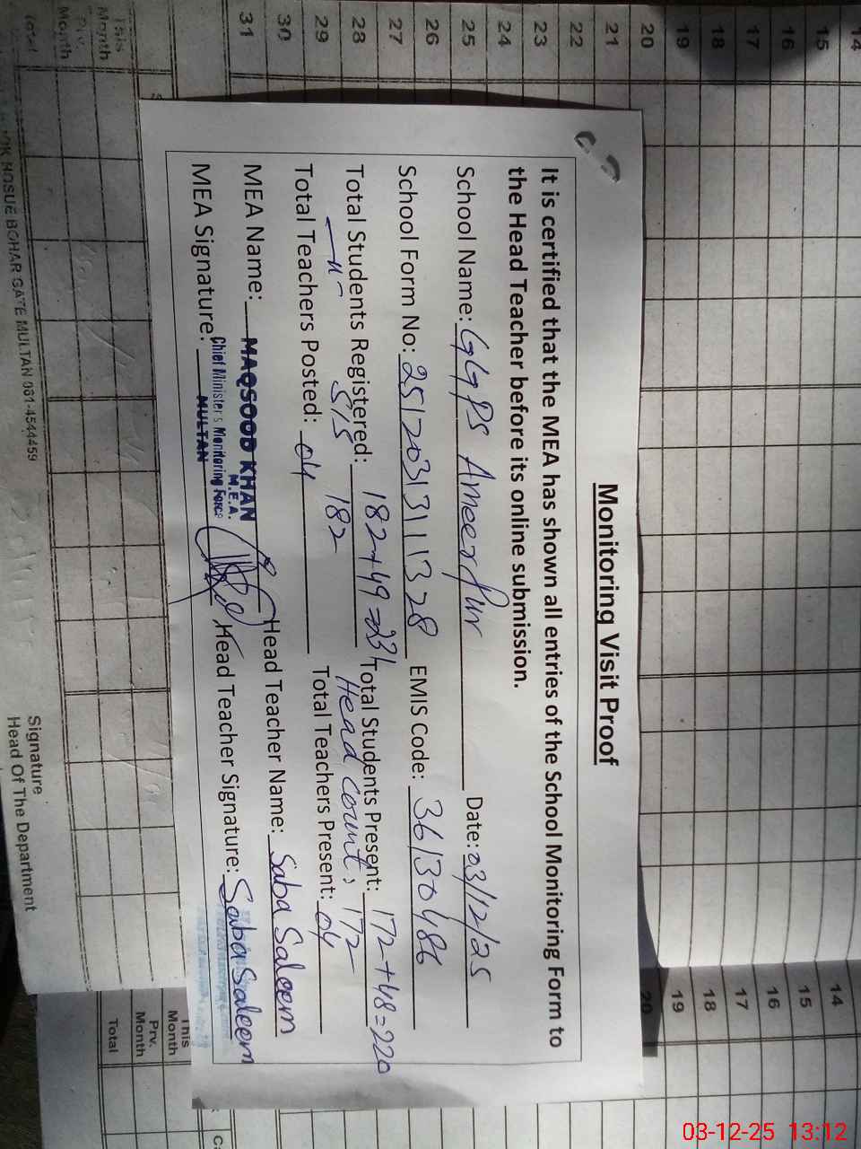 | EMIS Code: 36130486 | Name of School: GGPS AMEER PUR | |||