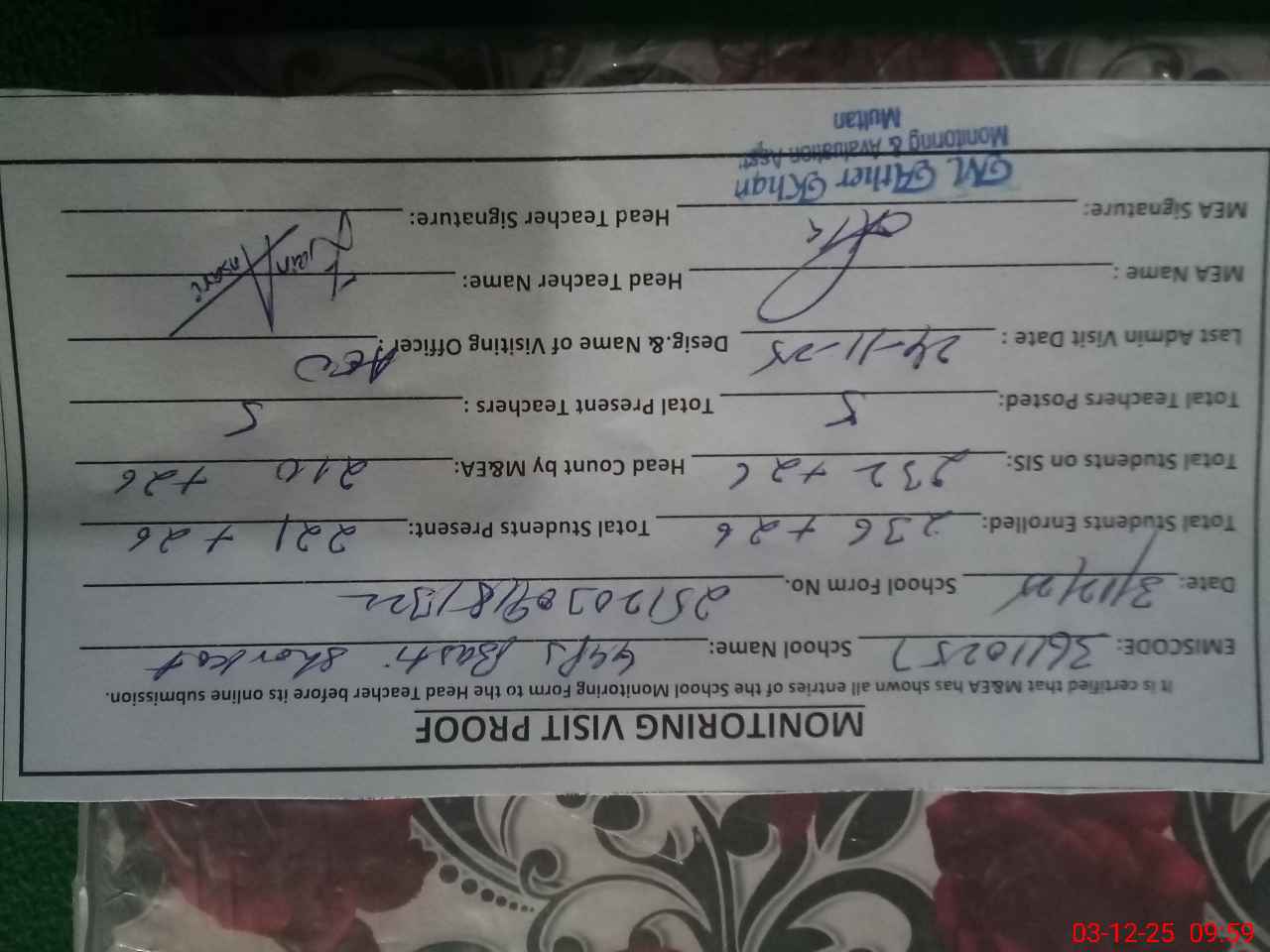 | Certified that this School was Inspected by the Undersigned MEA/DMO Today and the Information Stated Above is as Per Record. | |||||