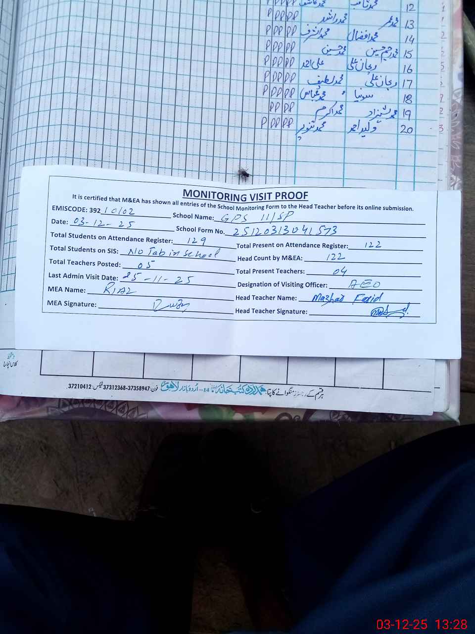 | Attendance Register | Head Teacher | MEA with School | Visit Proof |