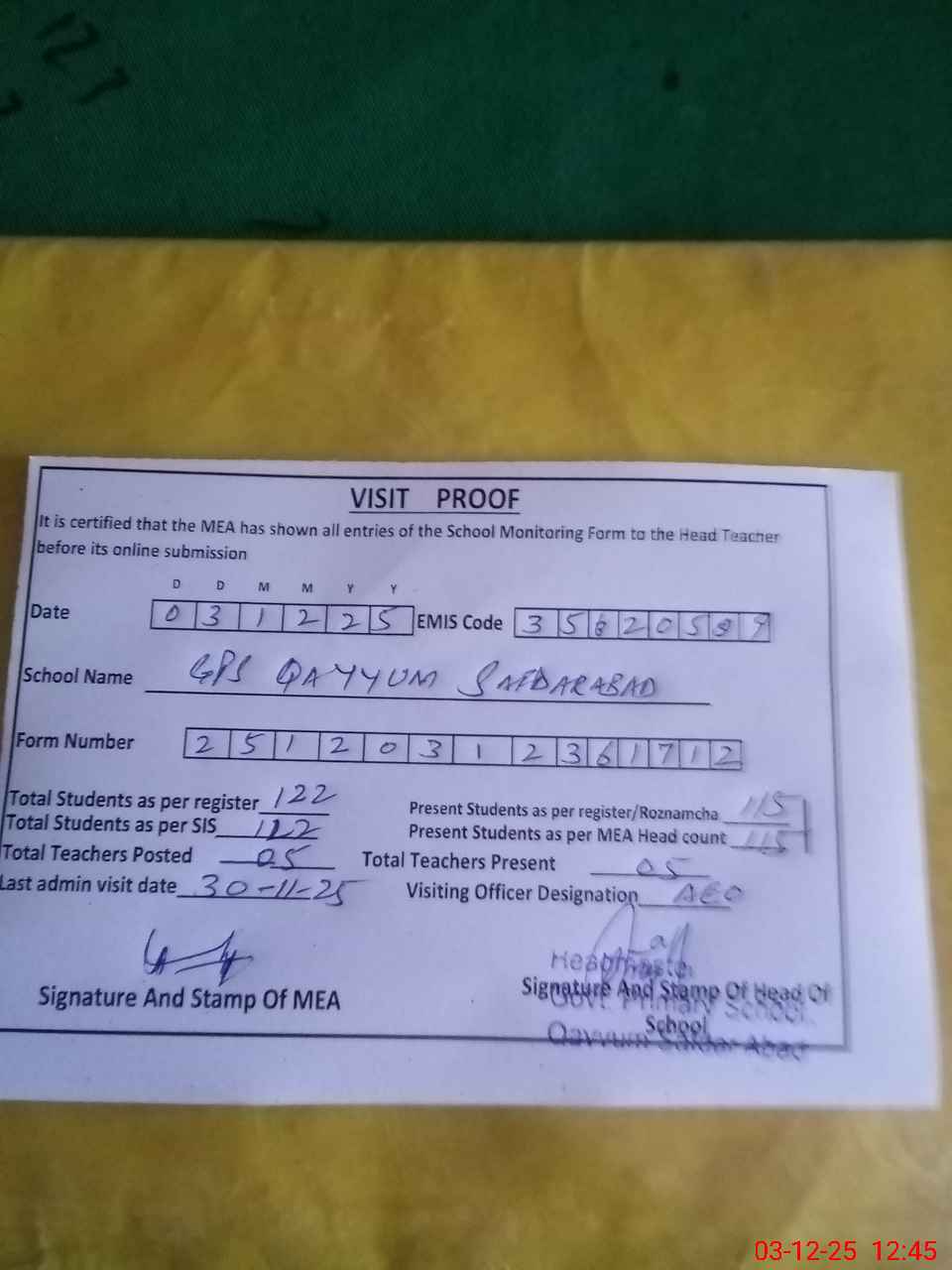 | Attendance Register | Head Teacher | MEA with School | Visit Proof |