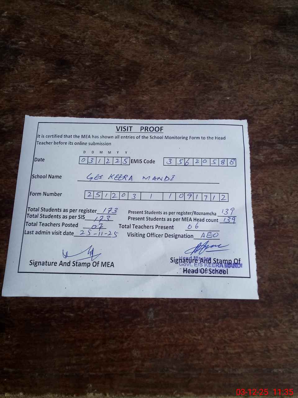 | Attendance Register | Head Teacher | MEA with School | Visit Proof |