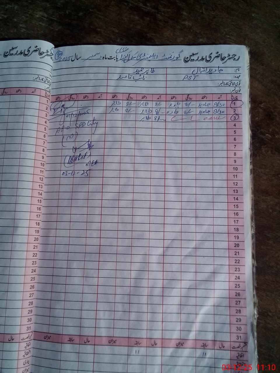 | CNIC | Full Name | Designation | R/C | Absence During Last Calender Month |