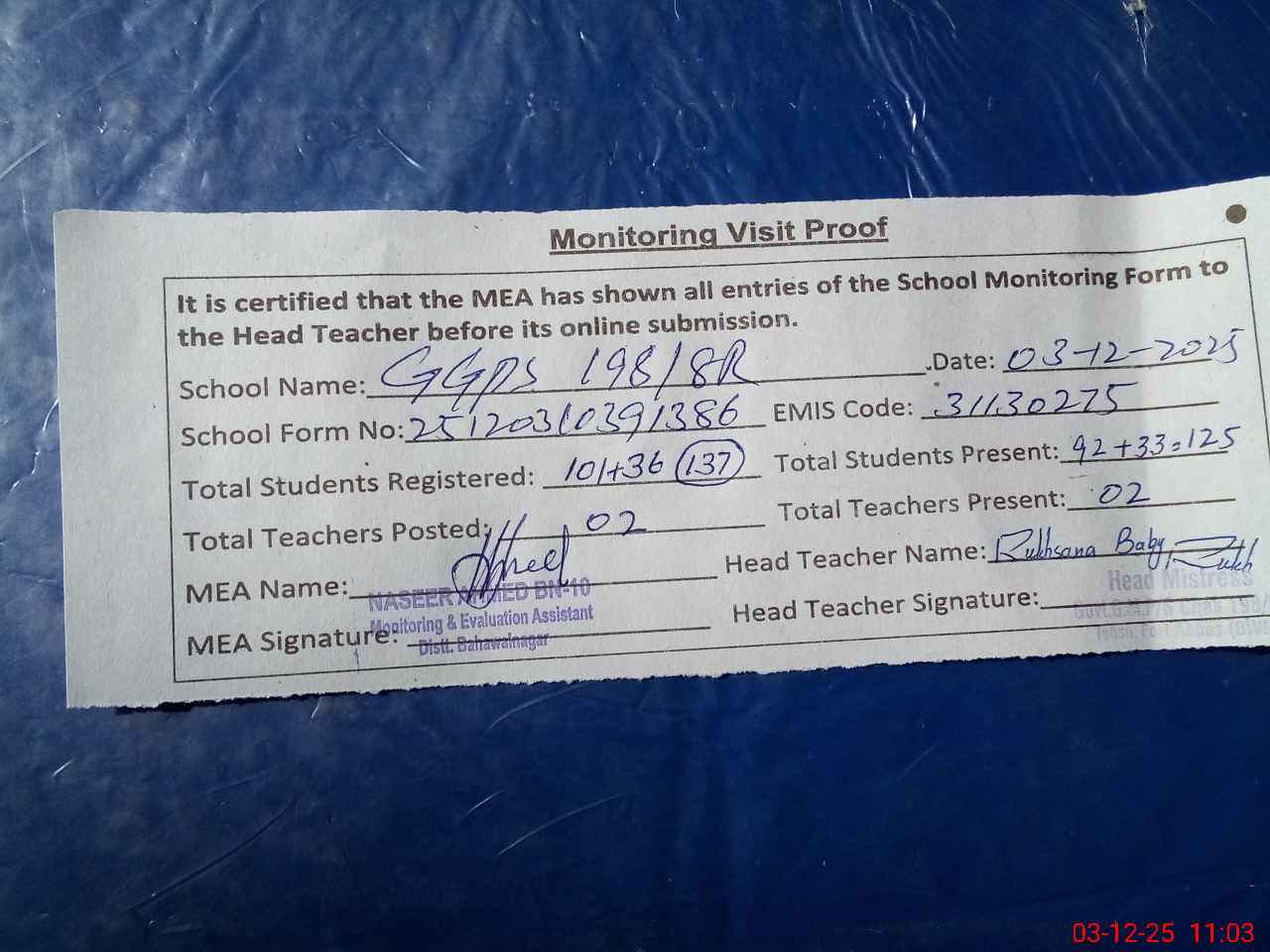 | EMIS Code: 31130275 | Name of School: GGPS CHAK NO 198 8R | |||