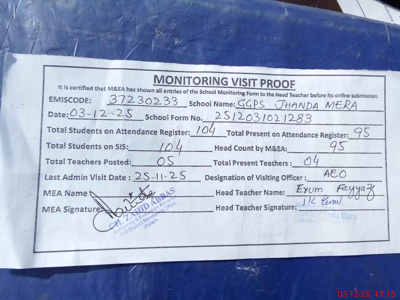 | EMIS Code: 37230233 | Name of School: GGPS JHANDA MERA | |||