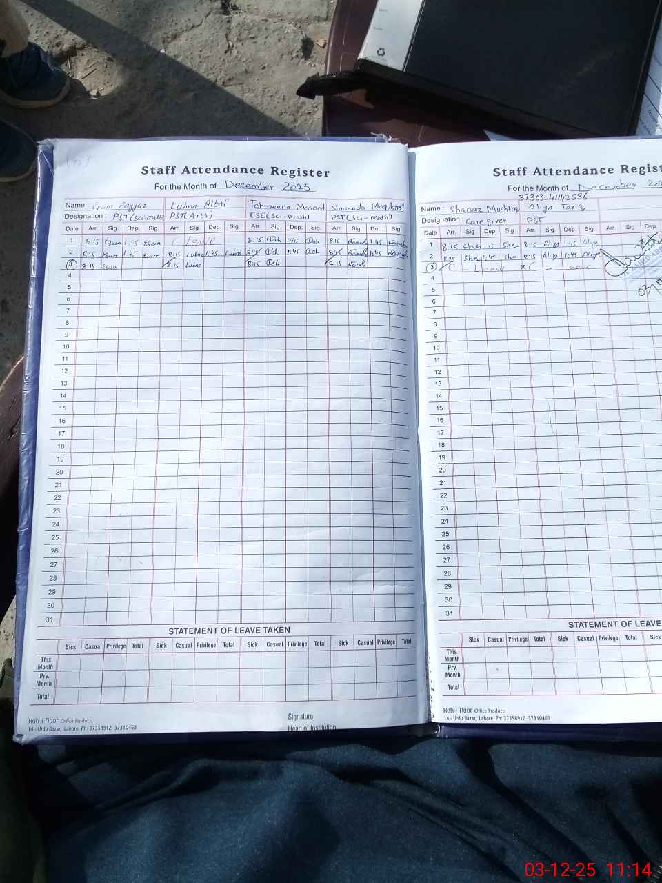 | Total no. of Classrooms: 3 No. of Classrooms Used for Teaching: 3 No. of Classrooms Storing Old Furniture, FTBs, etc: 0Comments if Any: Aliya Tariq PST teacher marked casual leave in attendance register but online leave not available so said teacher in authorized absent from school. |