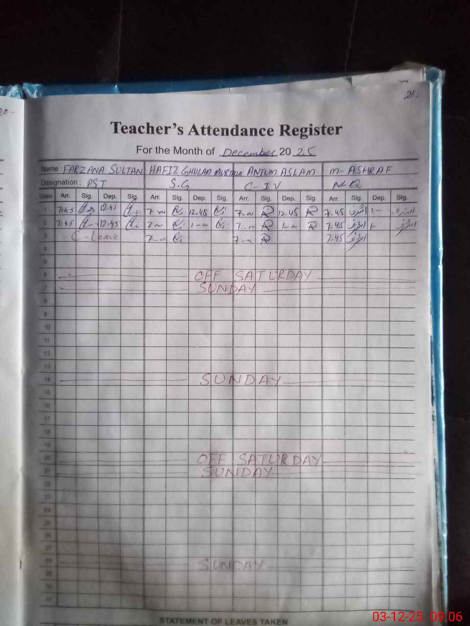 | CNIC | Full Name | Designation | R/C | Absence During Last Calender Month |