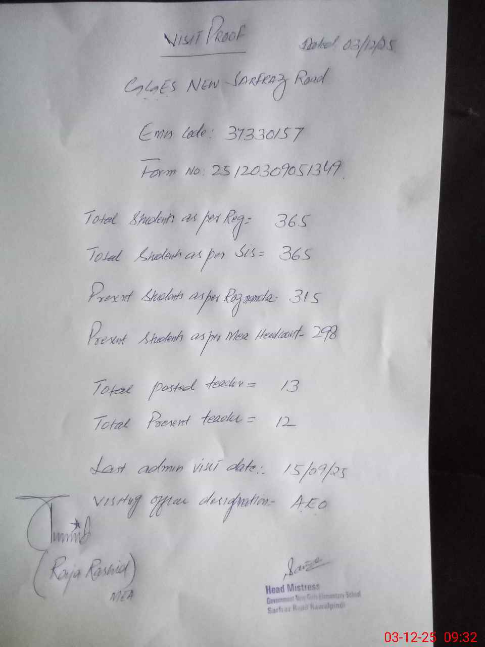 | Attendance Register | Head Teacher | MEA with School | Visit Proof |