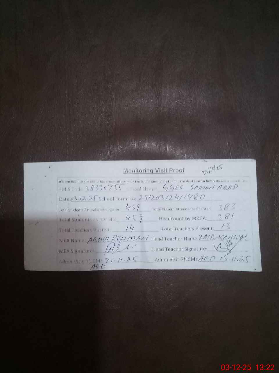 | Attendance Register | Head Teacher | MEA with School | Visit Proof |
