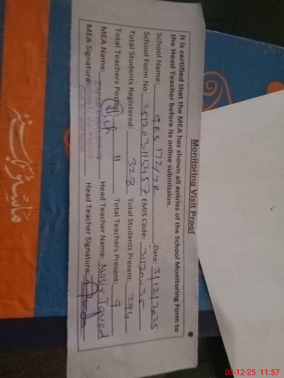 | Attendance Register | Head Teacher | MEA with School | Visit Proof |
