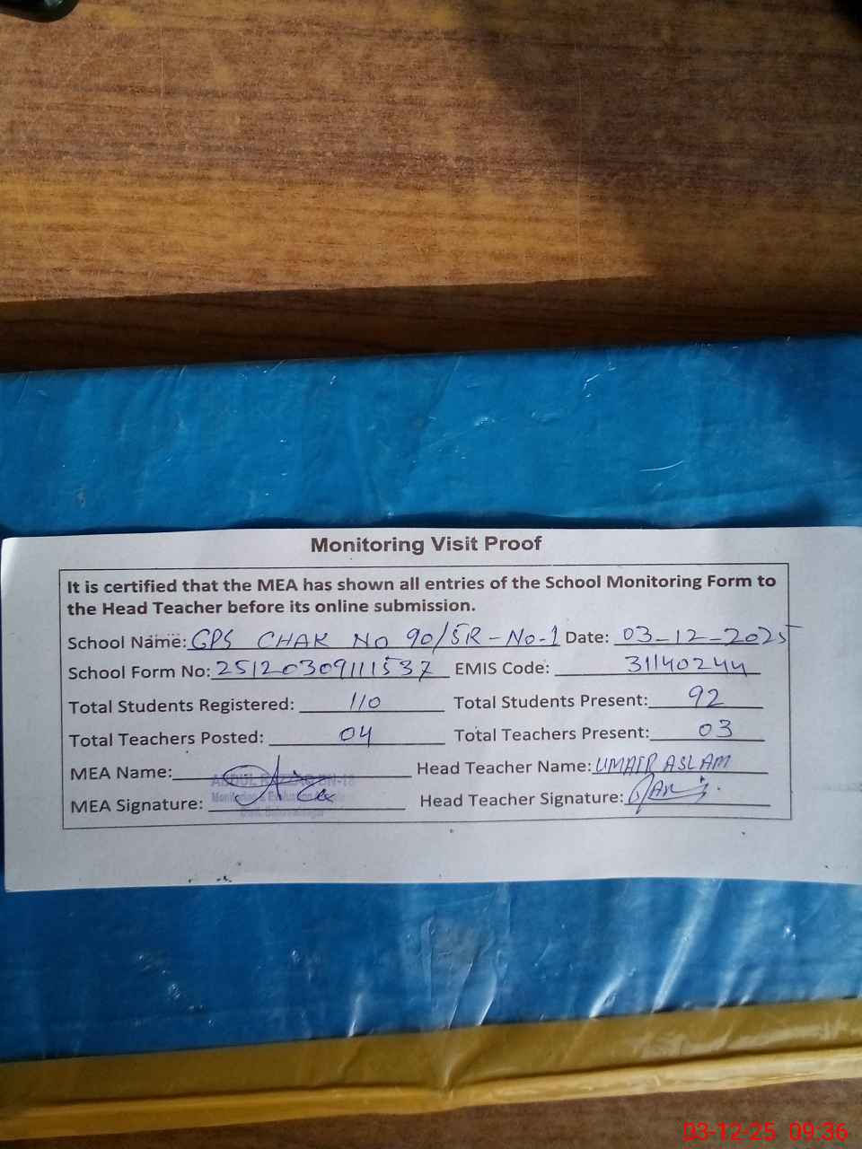 | Attendance Register | Head Teacher | MEA with School | Visit Proof |