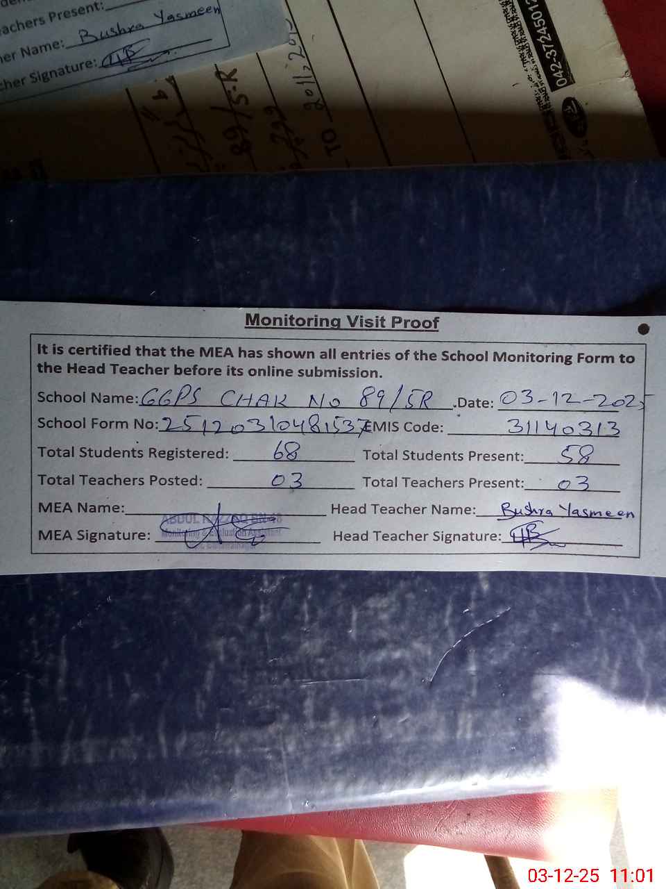 | EMIS Code: 31140313 | Name of School: GGPS CHAK NO 89/5-R | |||