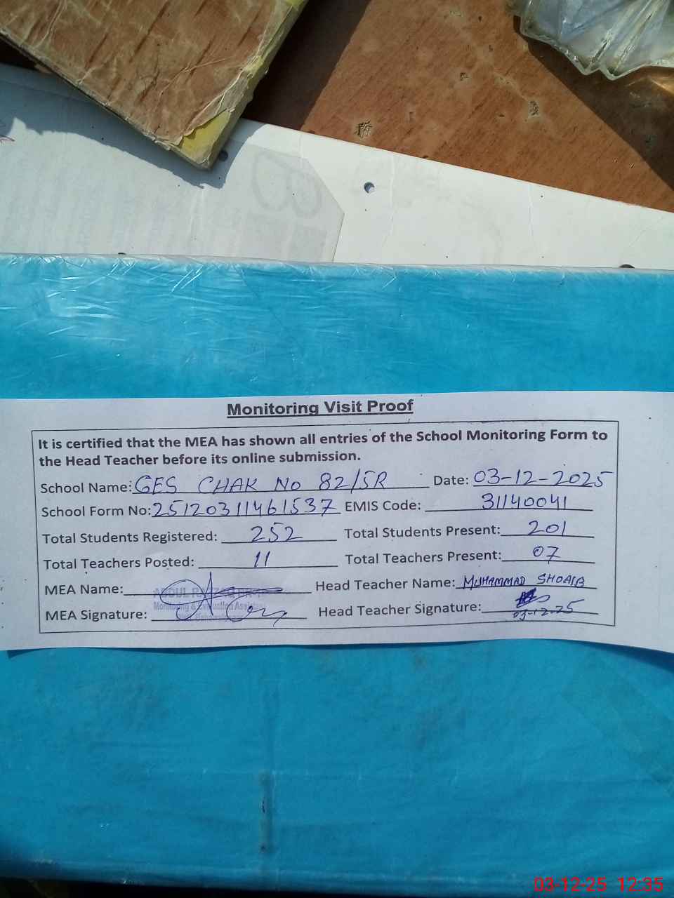 | Attendance Register | Head Teacher | MEA with School | Visit Proof |