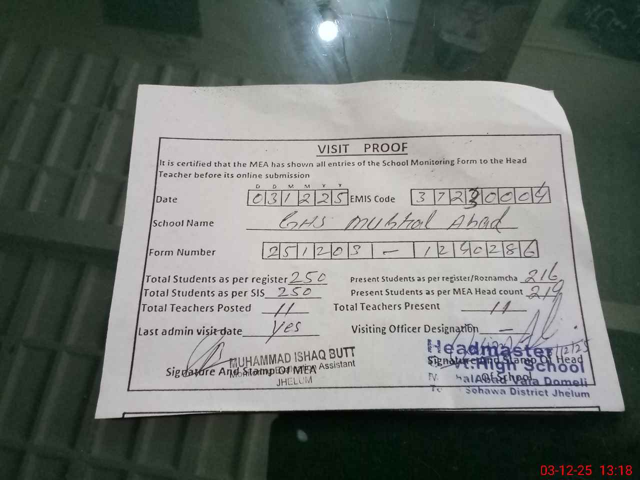 | Attendance Register | Head Teacher | MEA with School | Visit Proof |