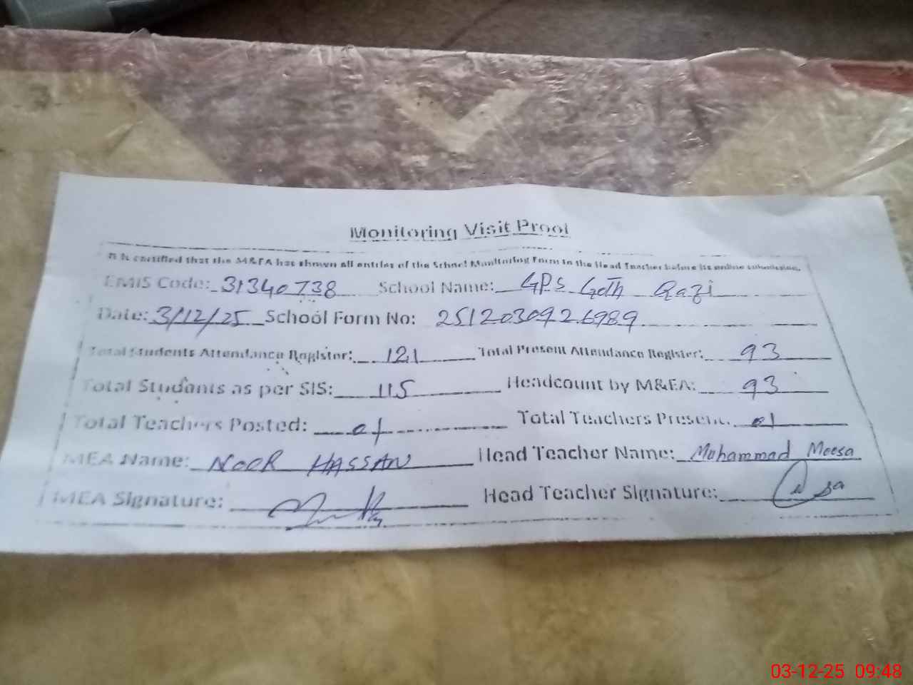 | Attendance Register | Head Teacher | MEA with School | Visit Proof |