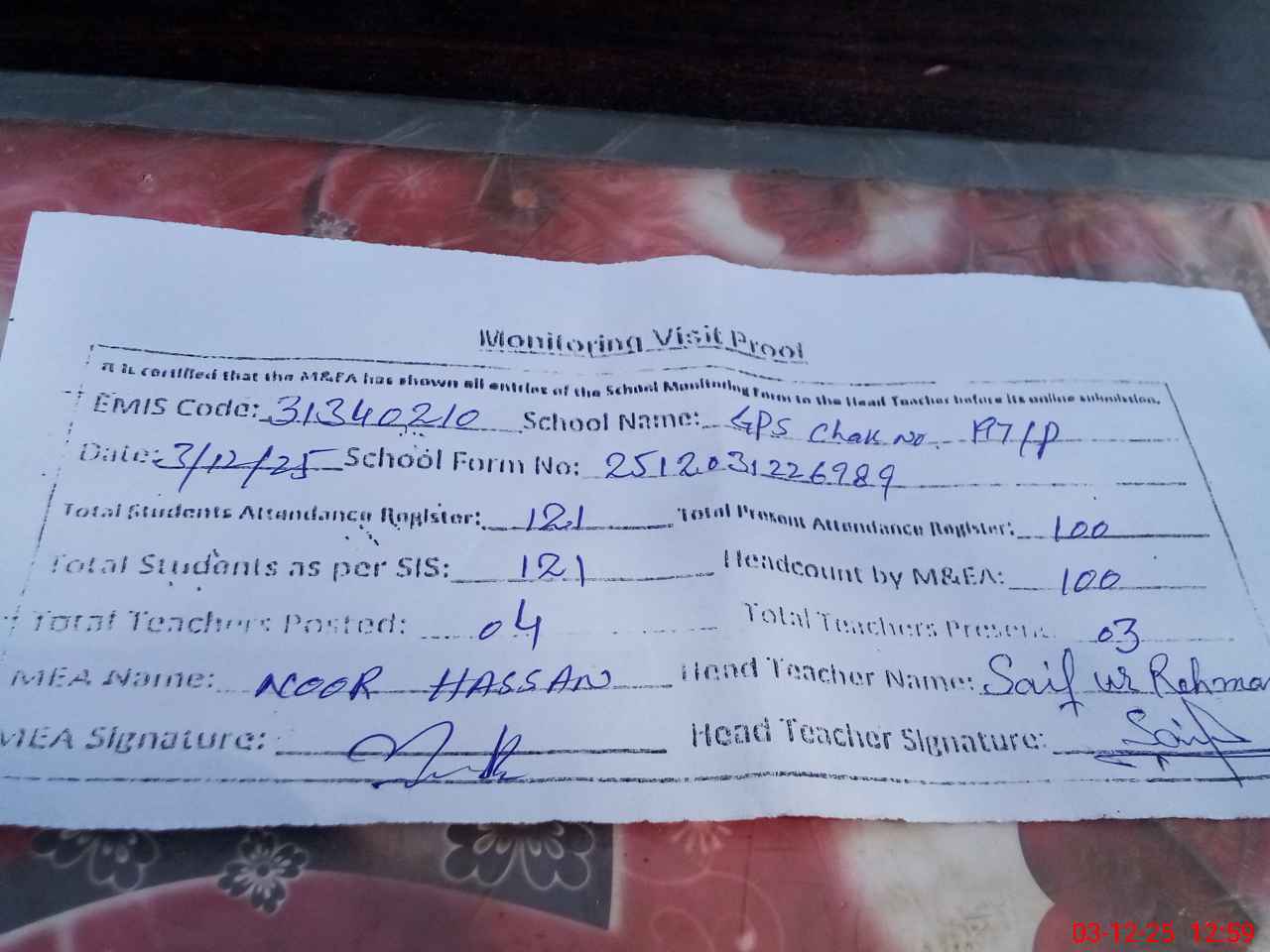 | Attendance Register | Head Teacher | MEA with School | Visit Proof |