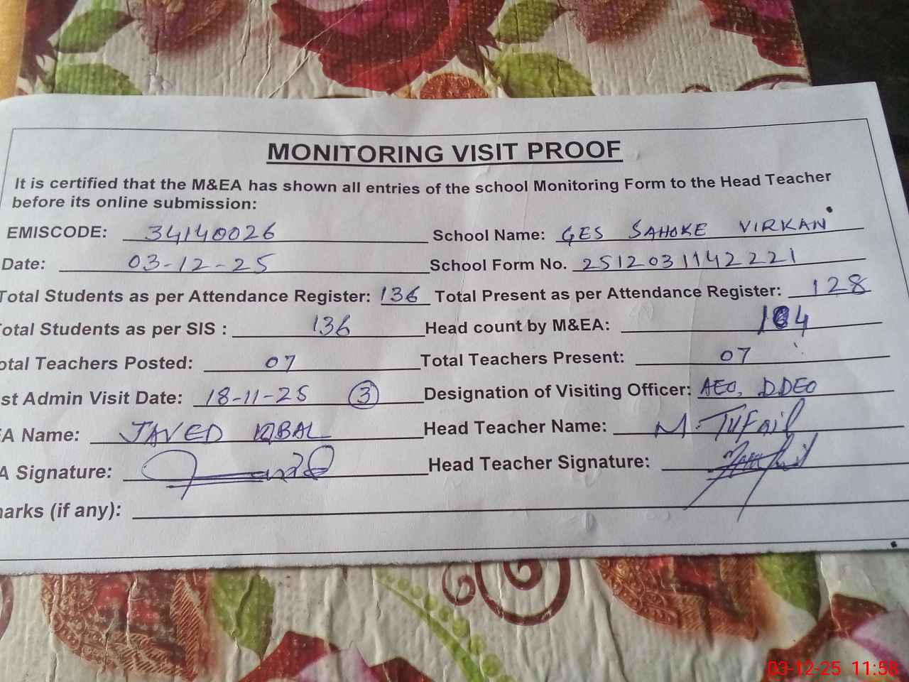 | Attendance Register | Head Teacher | MEA with School | Visit Proof |
