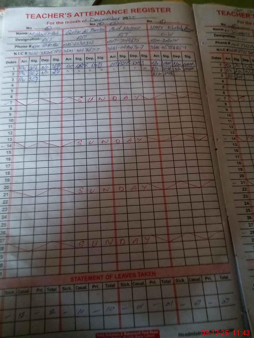 | CNIC | Full Name | Designation | R/C | Absence During Last Calender Month |