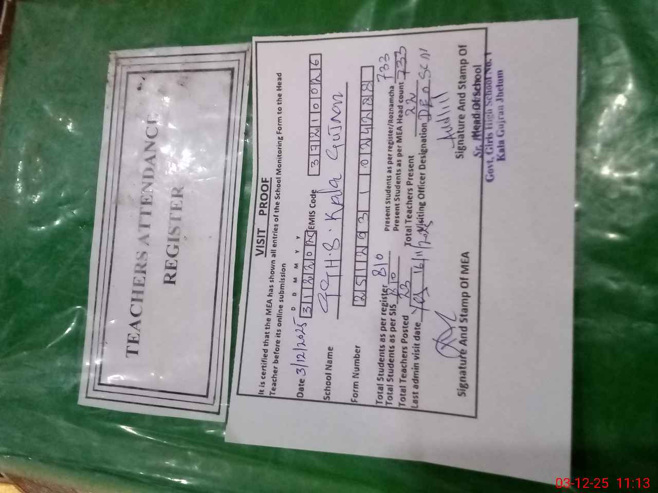 | Attendance Register | Head Teacher | MEA with School | Visit Proof |