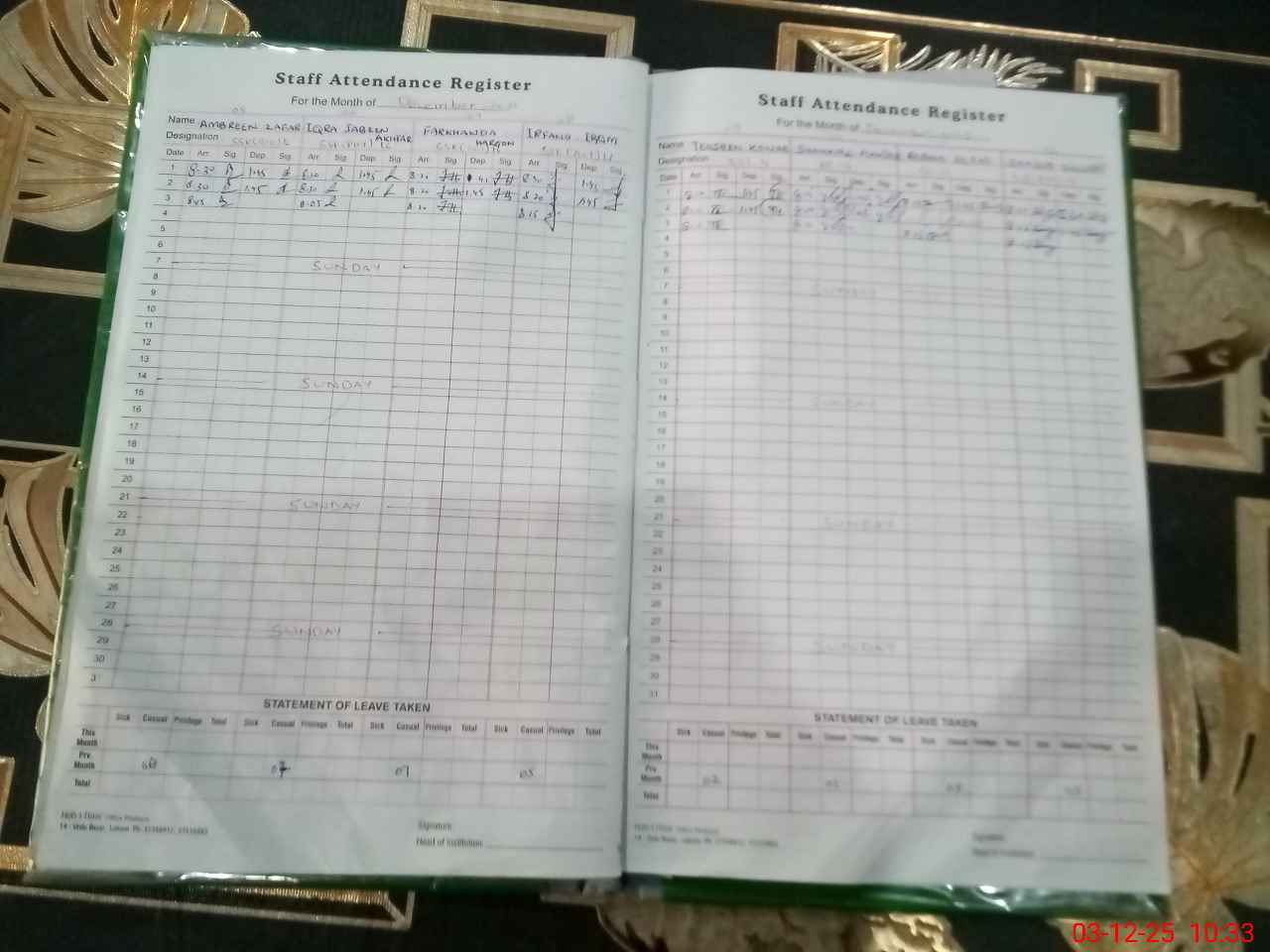 | Leave | Duty | Absent | Maternity | Medical | Ex- Pak |