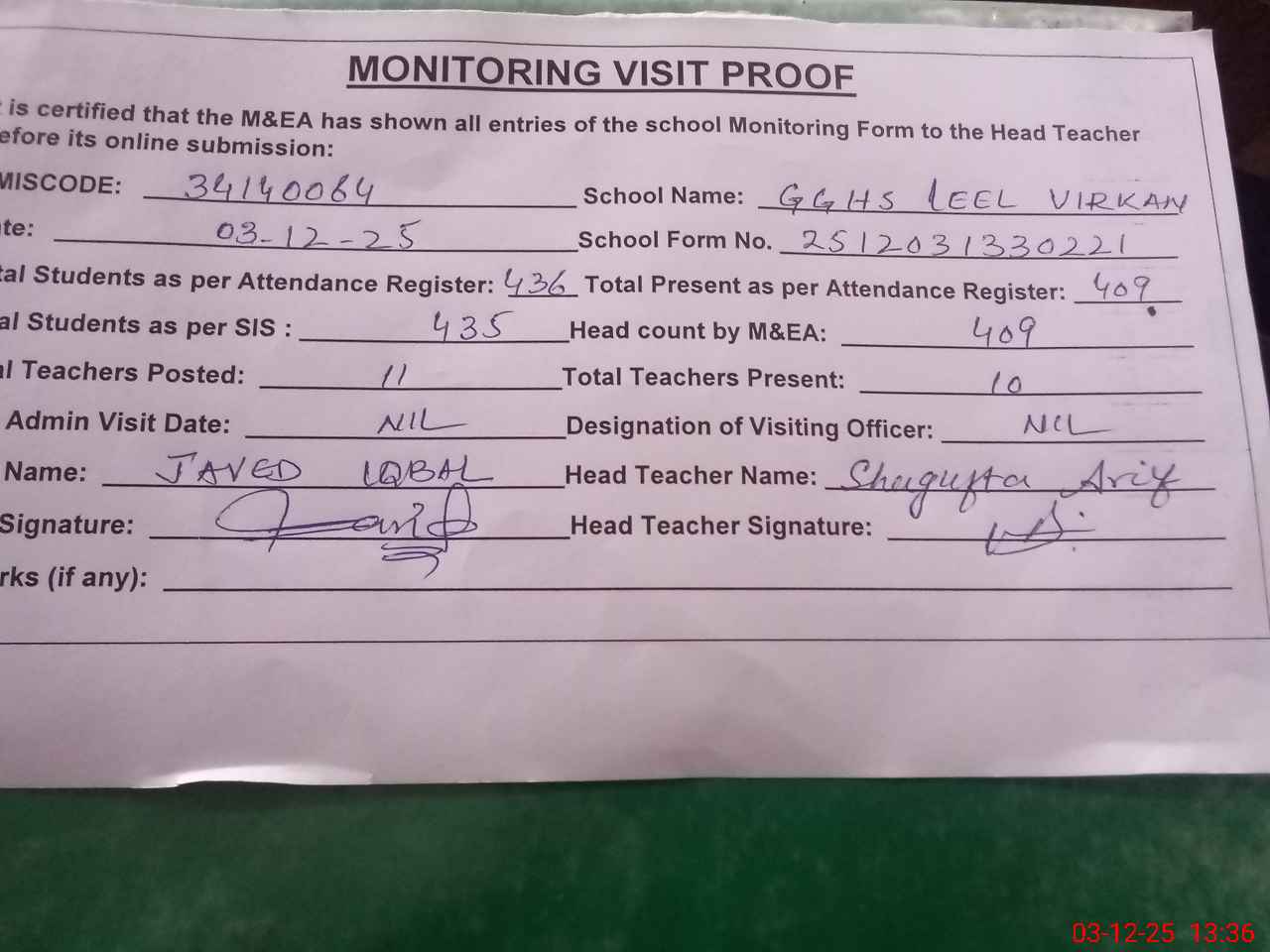 | Attendance Register | Head Teacher | MEA with School | Visit Proof |