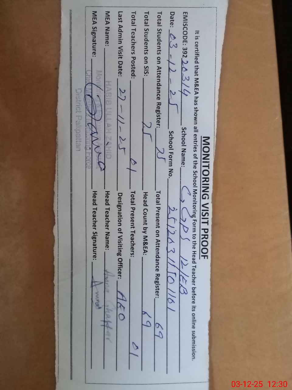 | Attendance Register | Head Teacher | MEA with School | Visit Proof |