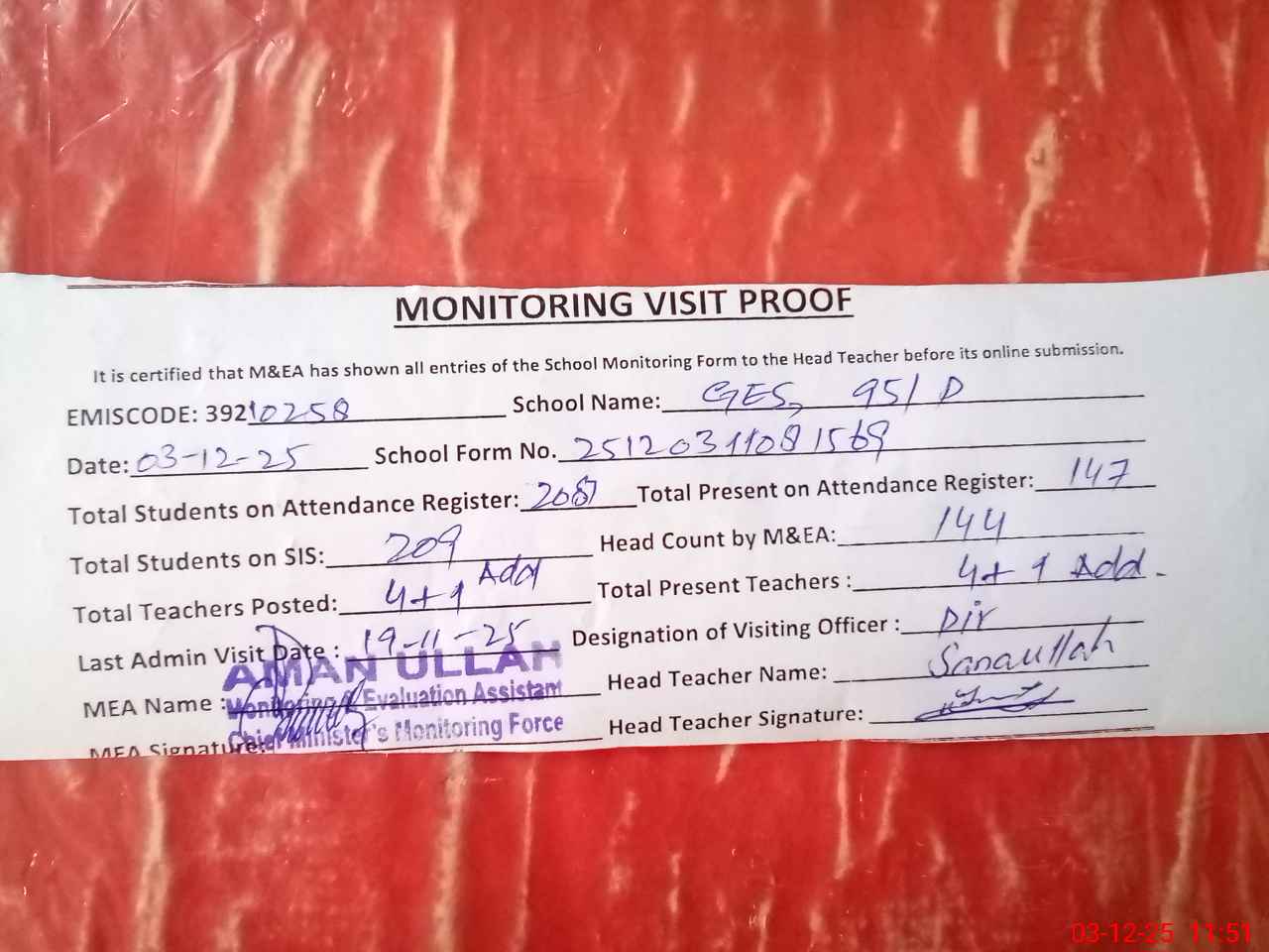 | EMIS Code: 39210258 | Name of School: GES CHAK NO. 95 /D | |||