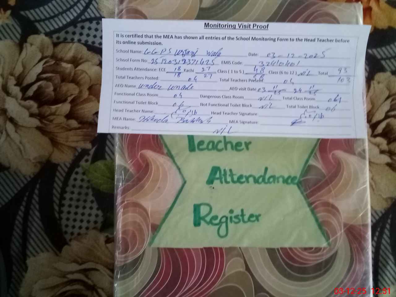 | Attendance Register | Head Teacher | MEA with School | Visit Proof |