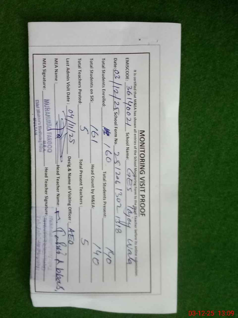 | Attendance Register | Head Teacher | MEA with School | Visit Proof |