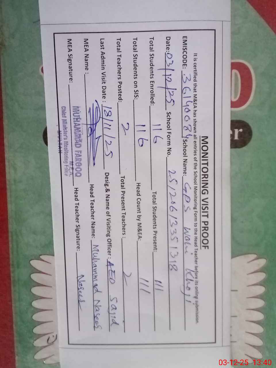 | Certified that this School was Inspected by the Undersigned MEA/DMO Today and the Information Stated Above is as Per Record. | |||||