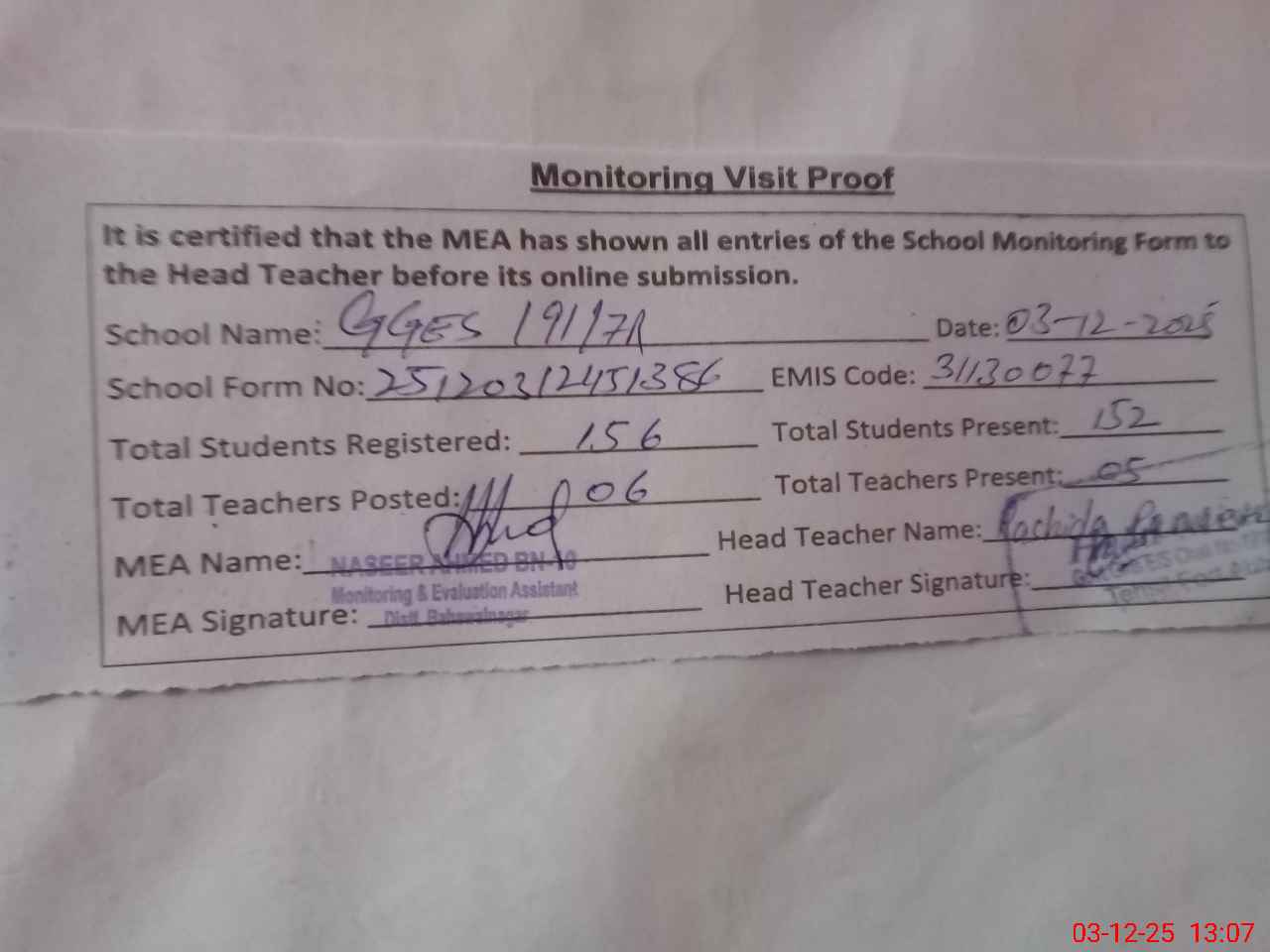 | EMIS Code: 31130077 | Name of School: GGES CHAK NO 191/7-R | |||