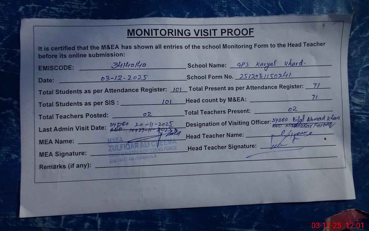 | EMIS Code: 34140140 | Name of School: GPS KARYAL KHURD | |||