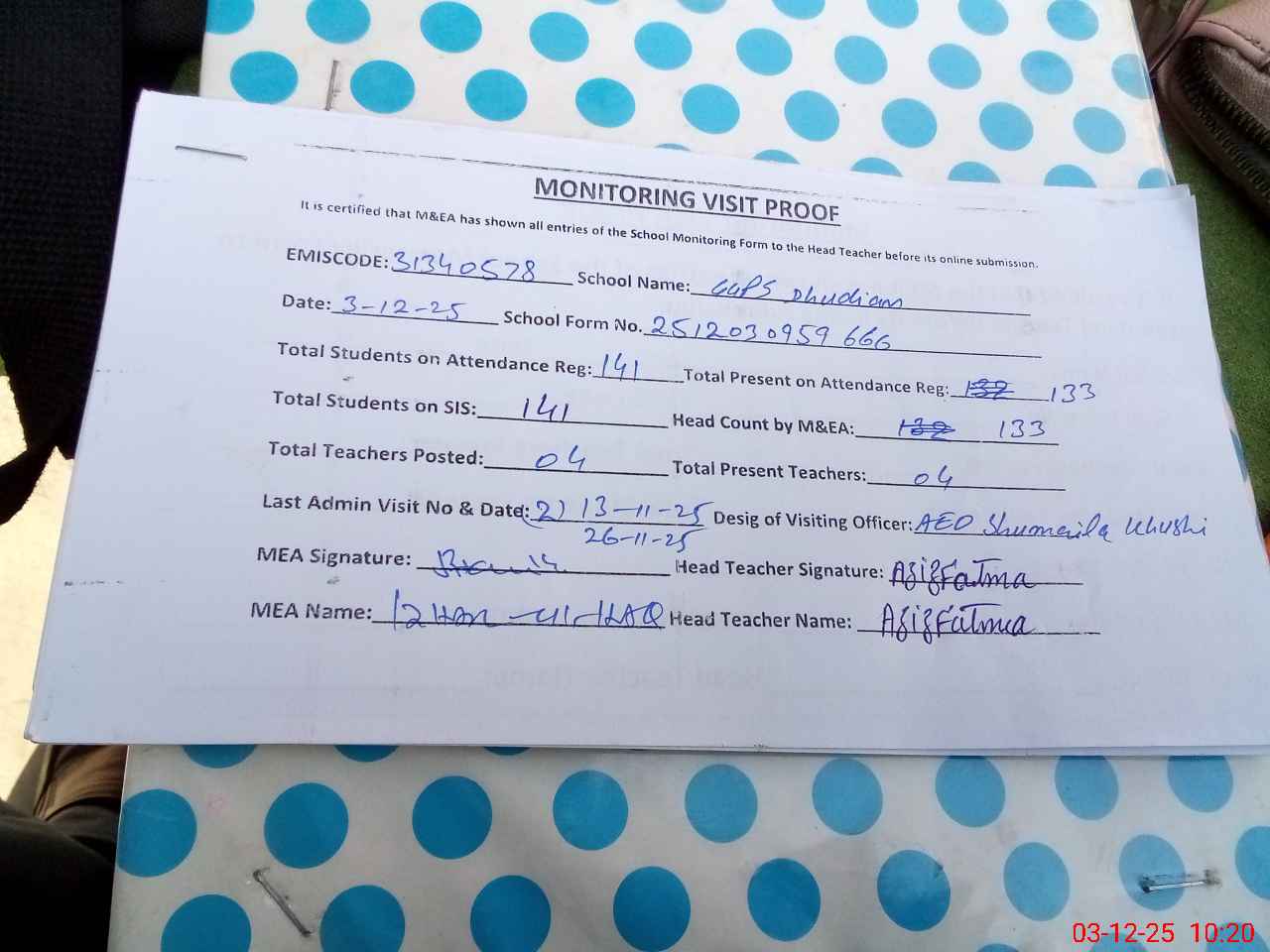 | Attendance Register | Head Teacher | MEA with School | Visit Proof |