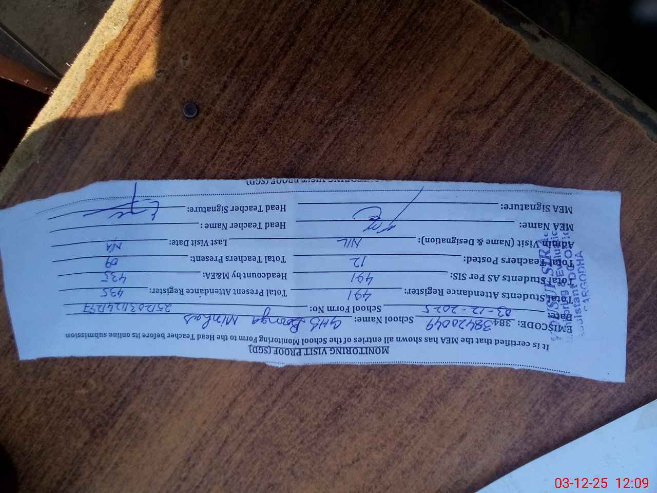 | Attendance Register | Head Teacher | MEA with School | Visit Proof |