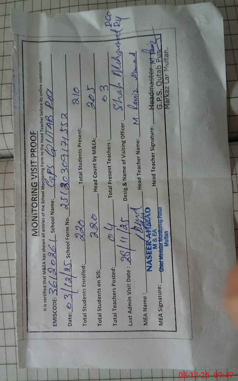 | EMIS Code: 36130261 | Name of School: GPS QUTAB PUR | |||