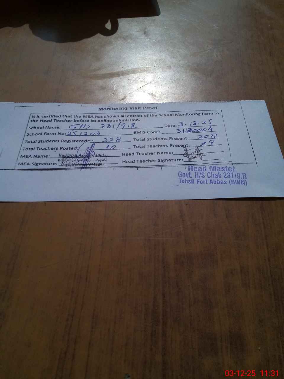 | EMIS Code: 31130004 | Name of School: GHS CHAK 231/9-R | |||