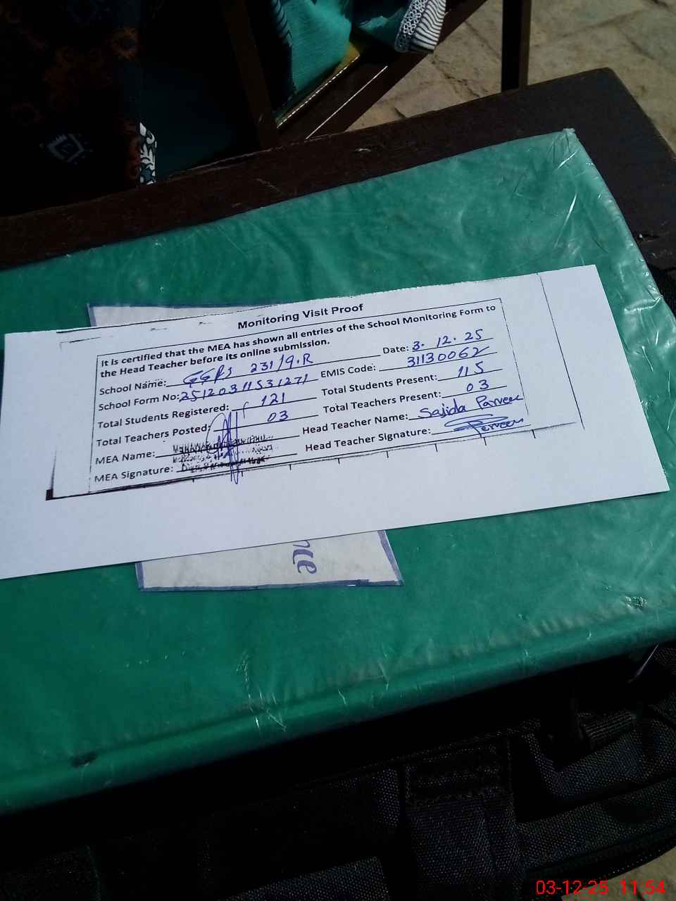 | Attendance Register | Head Teacher | MEA with School | Visit Proof |
