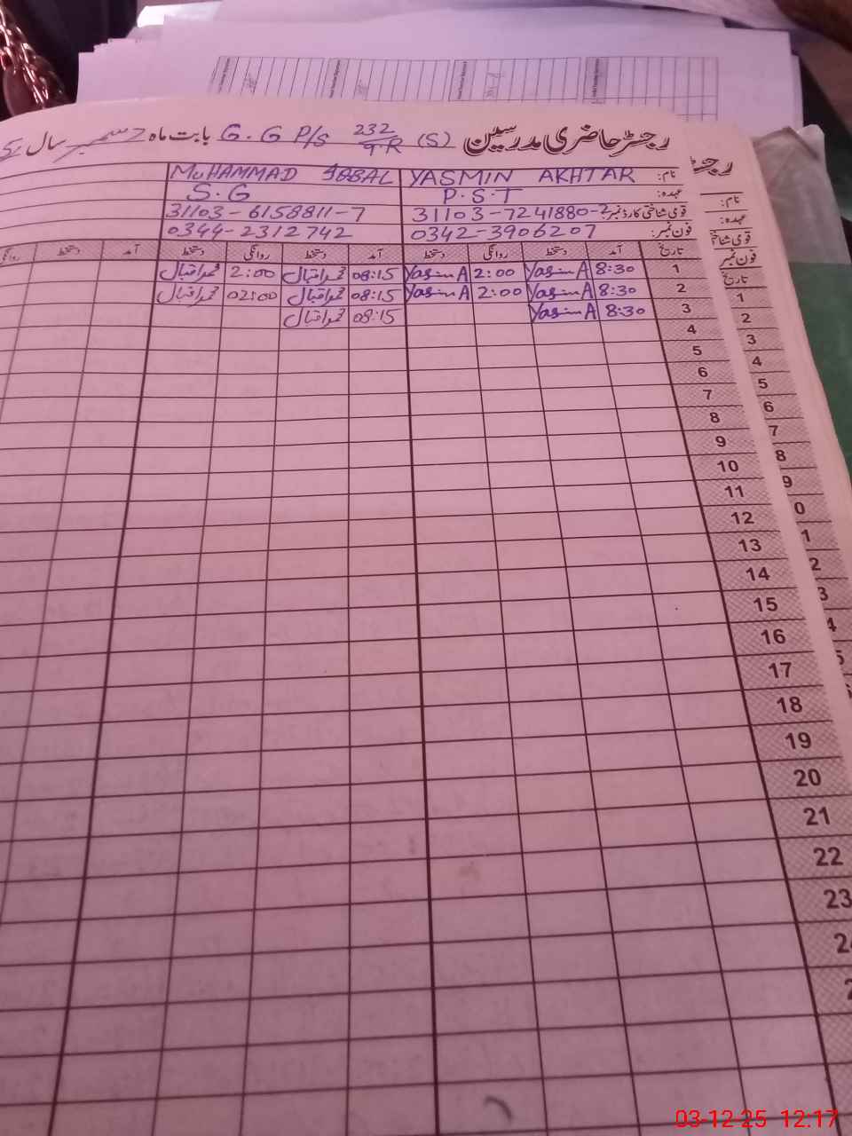 | CNIC | Full Name | Designation | R/C | Absence During Last Calender Month |