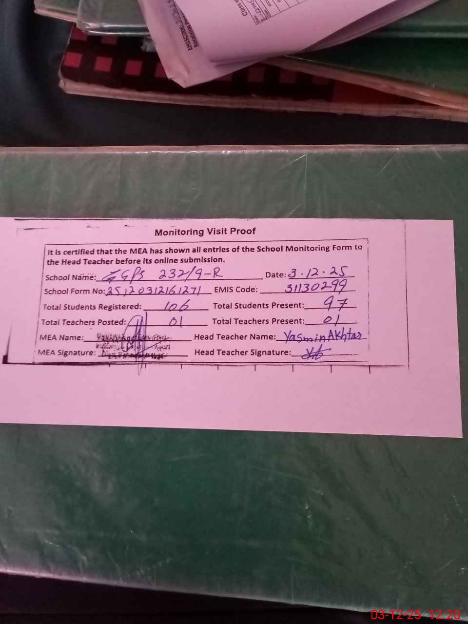 | Attendance Register | Head Teacher | MEA with School | Visit Proof |