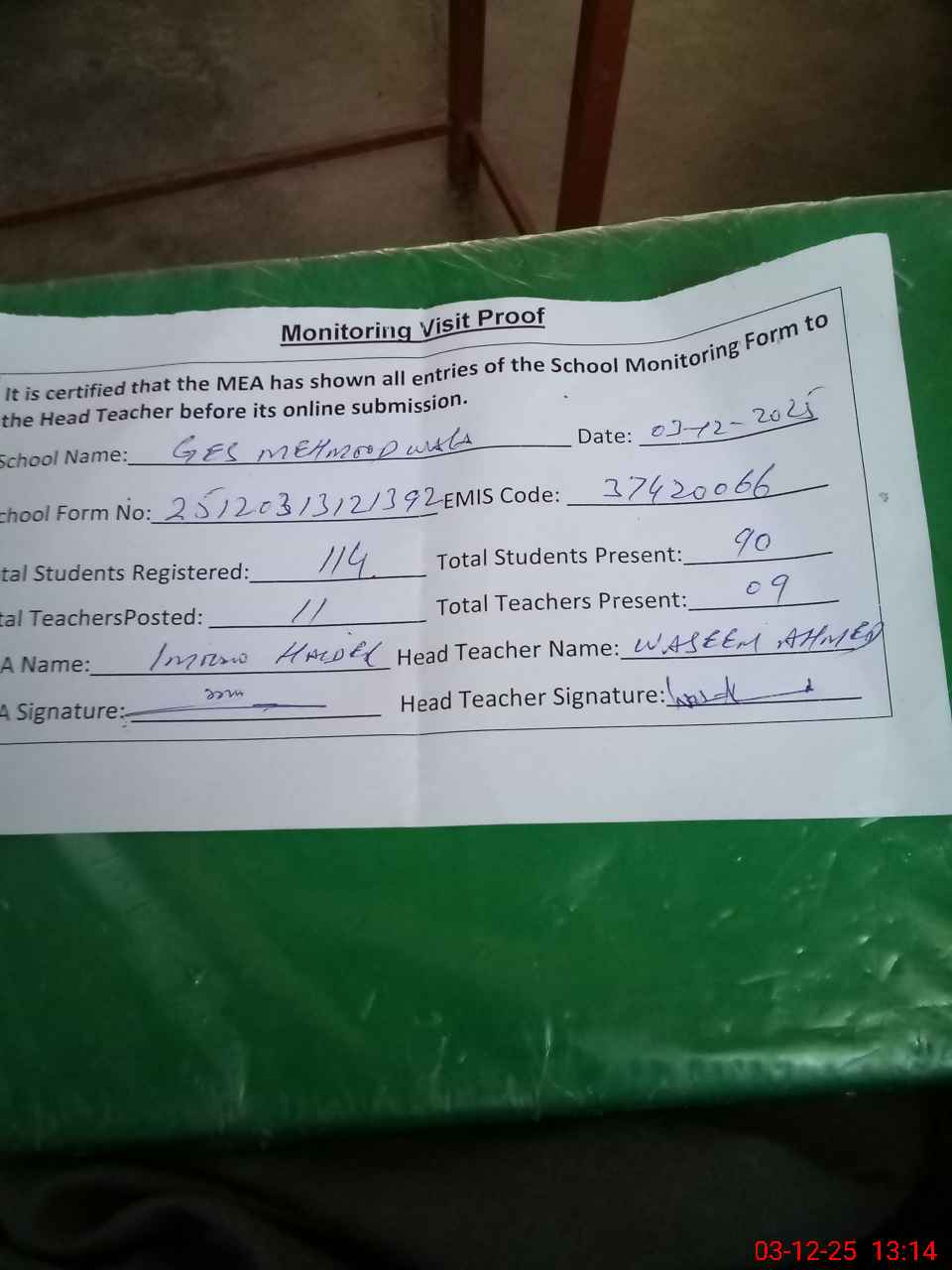 | Attendance Register | Head Teacher | MEA with School | Visit Proof |