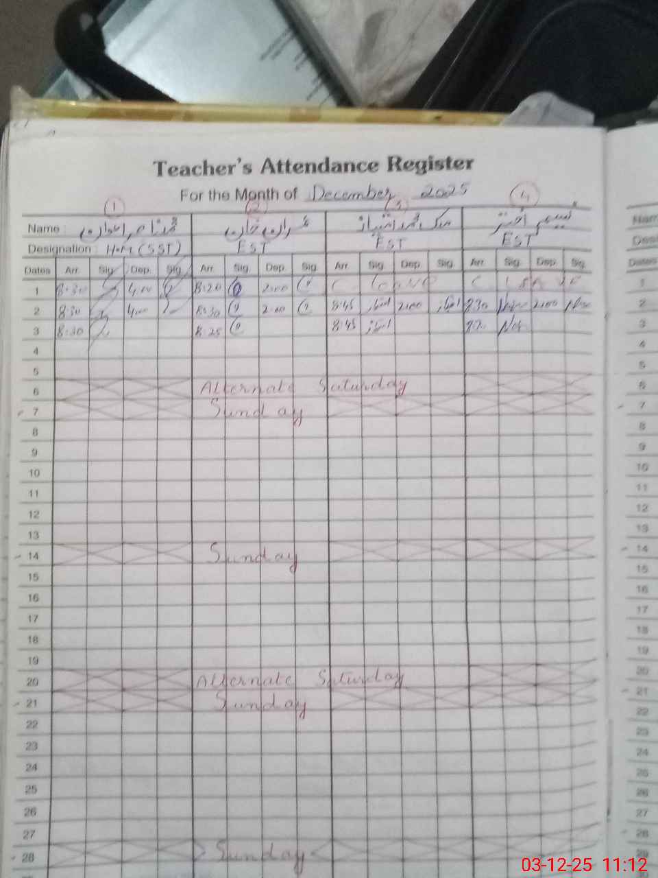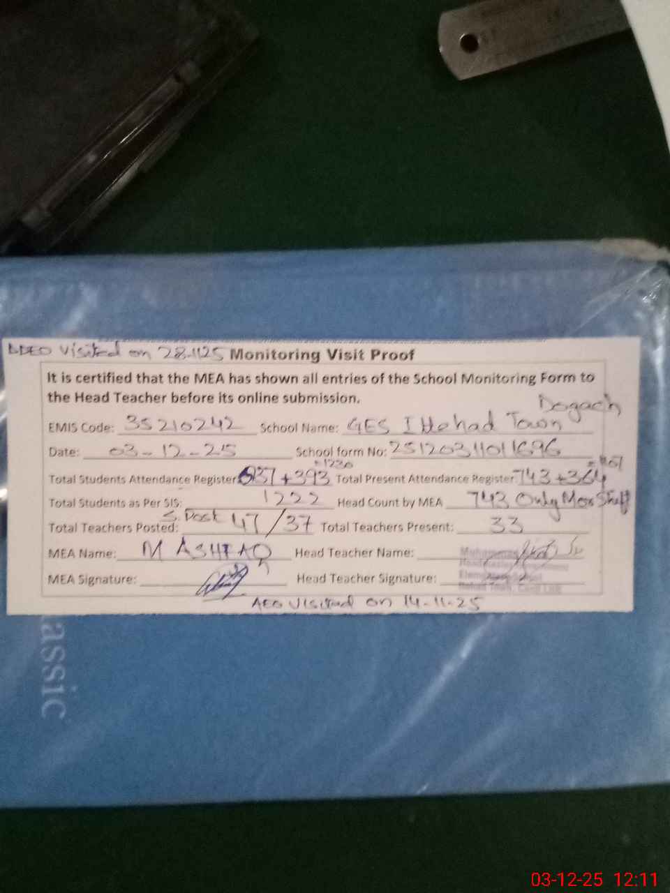 | Remarks (Use Separate Page if Required): DDEO Nasir Mehmood Doghar visited on 28-11-25 Last visit of AEO Shujah ur Rahman on 14-11-25 Teachers Sanctioned Post 47 and Filled 37 35210242 | |||||