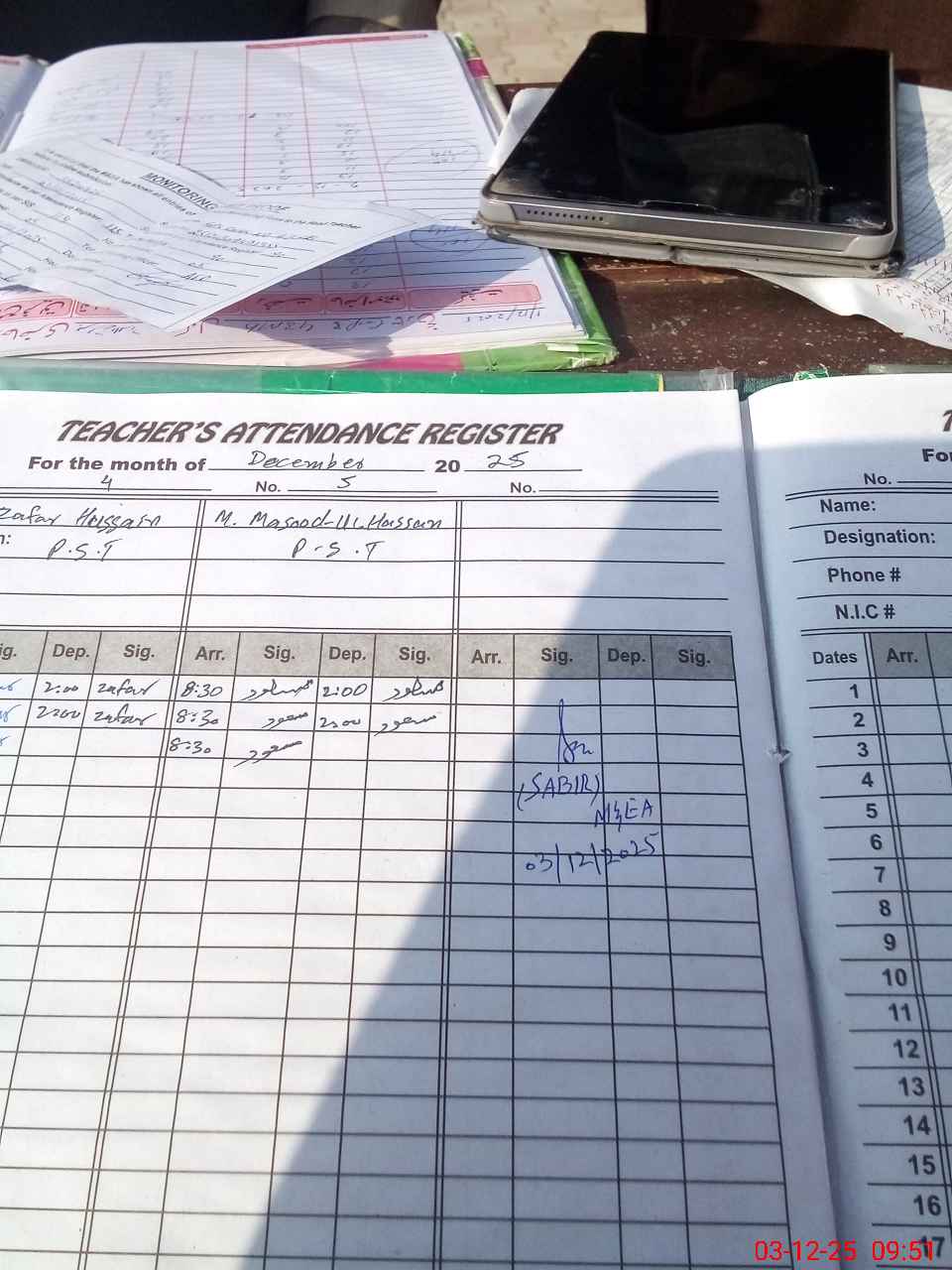 | Remarks (Use Separate Page if Required): no teacher absent total students on register 115 total students on SIS 114 present students 90 last admin visit by AEO on 21 Nov 2025 | |||||