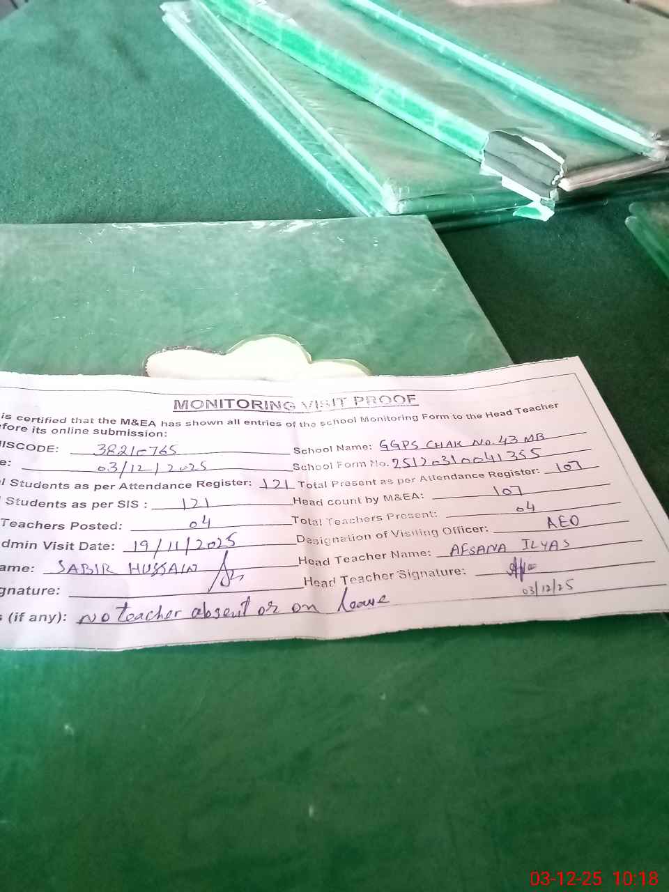 | EMIS Code: 38210765 | Name of School: GGPS CHAK NO 43 MB | |||
