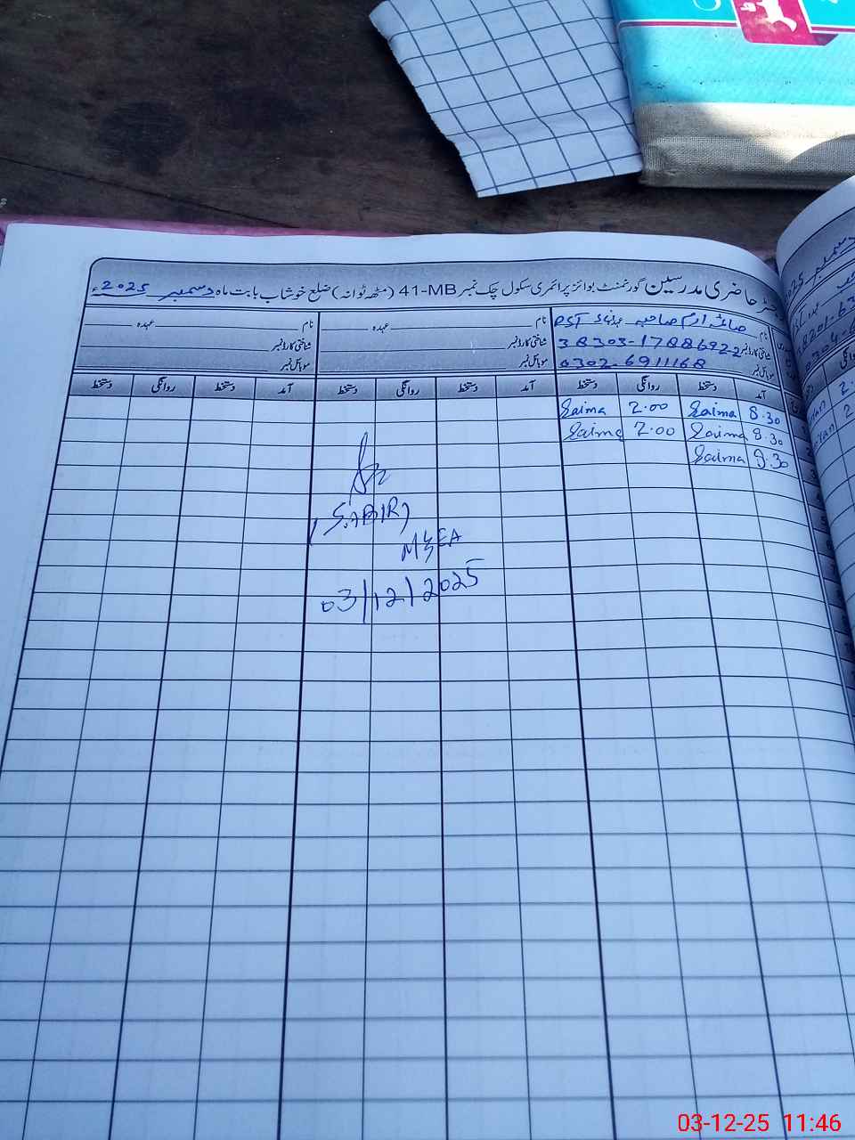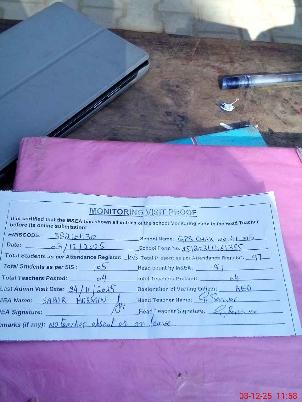 | Remarks (Use Separate Page if Required): no teacher absent total students on register 105 total students on SiS 105 present students 97 last admin visit by AEO on 24 Nov 2025 | |||||