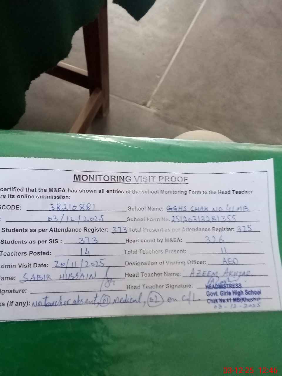 | Remarks (Use Separate Page if Required): no teacher absent total students on register 373 total students on SiS 373 present students 326 last admin visit by AEO on 20 Nov 2025 | |||||