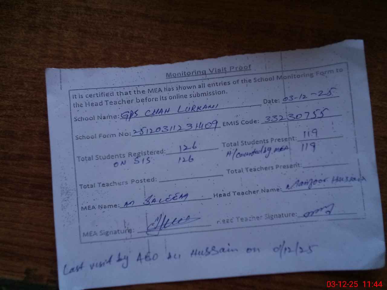 | EMIS Code: 33230755 | Name of School: GPS CHAH LURKANI | |||